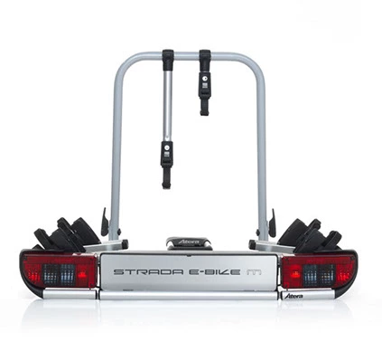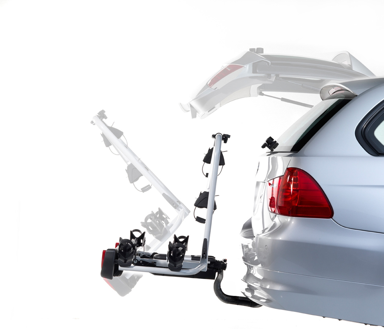 230mm grosse Abstände zwischen den Fahrradschienen für ausladende Elektromotoren und Akkus. Gesicherter Abklappmechanismus für schnellen Zugang zum Kofferraum, selbst im beladenen Zustand. Crash- und ausweichstabil. Optional gibt es auch noch eine Auffahrschiene.