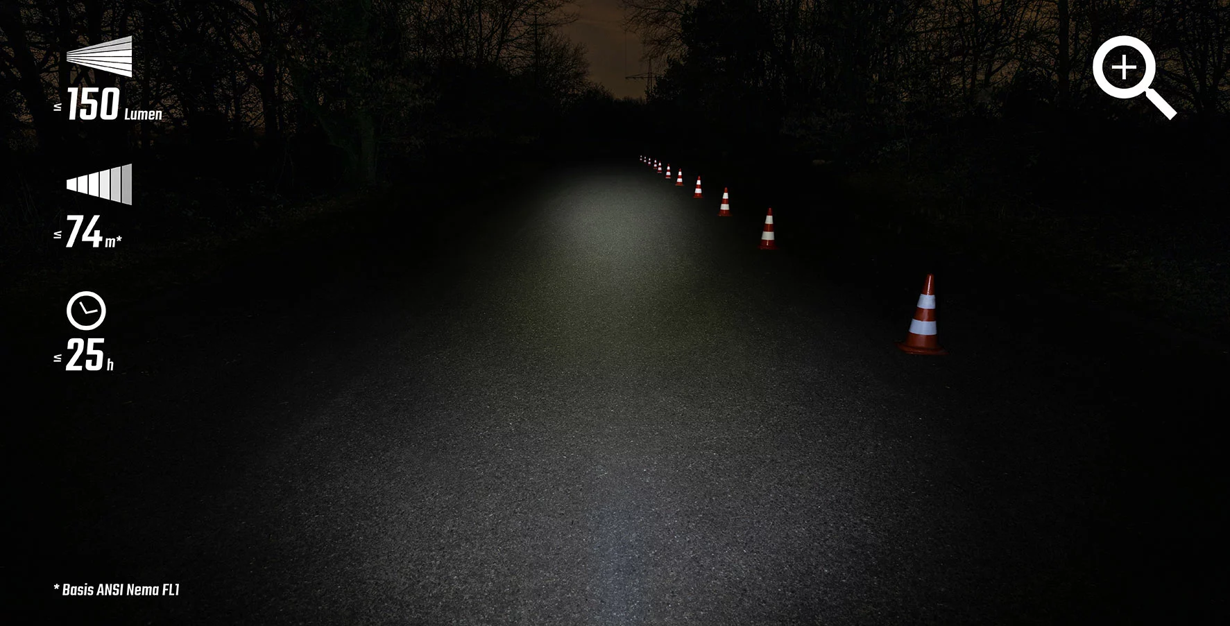 – 150 Lumen mit 74 m Strahl