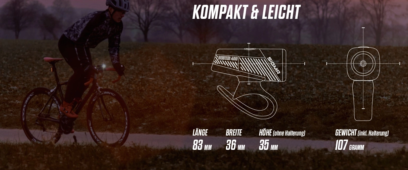 – Mit 400 Lumen und 120m Leuchtweite perfekte Sicht für sportliche Abendfahrten