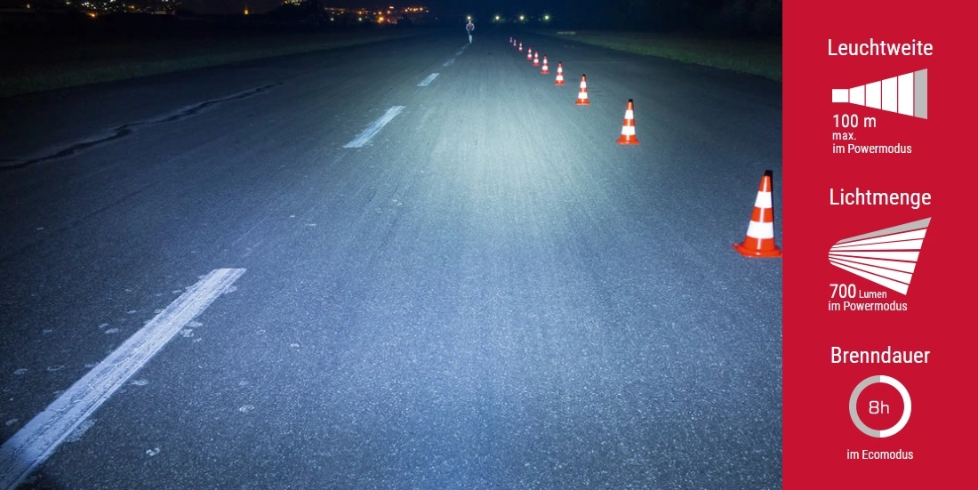 Die BUSTER 700 verfügt über die 3 Dauerleuchtmodi Power, Standard und Eco sowie einen Flash-Modus. Die maximale Brenndauer variiert je nach Leuchtintensität.